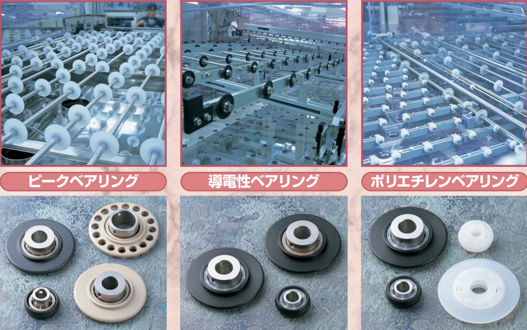 水回りで使用されるローラーコンベアにて、金属製のベアリングの腐食が課題だった
